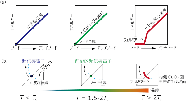図2: 銅酸化物高温超伝導体でのエネルギーギャップ。エネルギーギャップは、ノード方向(節方向)においてゼロであり、アンチノード方向(腹方向)で最大となるd波超伝導を示す(図1b)。(a)内側CuO2面でのエネルギーギャップの温度変化。T < Tcの超伝導状態では、ノード方向でエネルギーギャップがゼロ、アンチノード方向でエネルギーギャップが最大となるd波超伝導が存在する。温度を上昇させていくとT = 1.5-2Tcまでd波ギャップが維持されるノード金属状態が存在することが本研究で明らかになった。これは、T = 1.5-2Tcで既に超伝導電子が形成され始める前駆的超伝導電子が存在することを意味している。T > 2Tcでは、ノード金属状態が崩壊し、フェルミアークと呼ばれるフェルミ面の一部が消失したアーク上のフェルミ面のみが観測される。